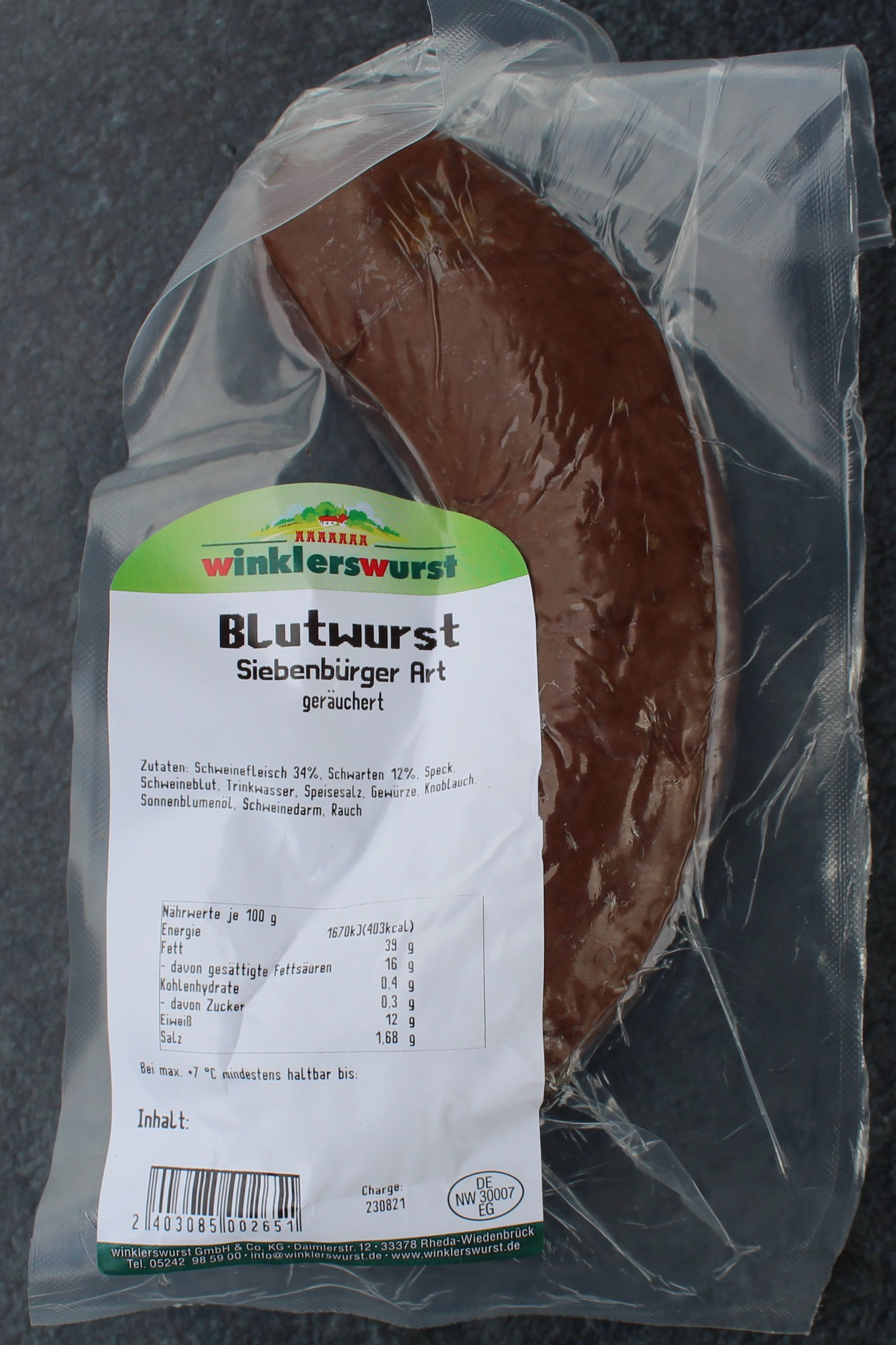 Herzhafte, hausgemachte Blutwurst mit großen Speckwürfeln. Leicht geräuchert und fein abgeschmeckt und mit feinen Speckstückchen durchzogen.